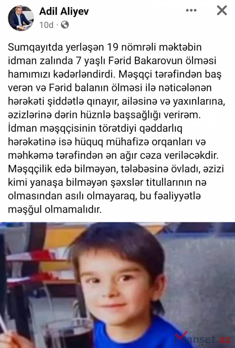 "Sumqayıtda yerləşən 19 nömrəli məktəbin idman zalında 7 yaşlı Fərid Bakarovun ölməsi hamımızı kədərləndirdi. Məşqçi tərəfindən baş verən və Fərid balanın ölməsi ilə nəticələnən hərəkəti şiddətlə qınayır, ailəsinə və yaxınlarına, əzizlərinə dərin hüznlə başsağlığı verirəm. İdman məşqçisinin törətdiyi qəddarlıq hərəkətinə isə hüquq mühafizə orqanları və məhkəmə tərəfindən ən ağır cəza veriləcəkdir. Məşqçilik edə bilməyən, tələbəsinə övladı, əzizi kimi yanaşa bilməyən şəxslər titullarının nə olmasından asılı olmayaraq, bu fəaliyyətlə məşğul olmamalıdır".