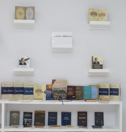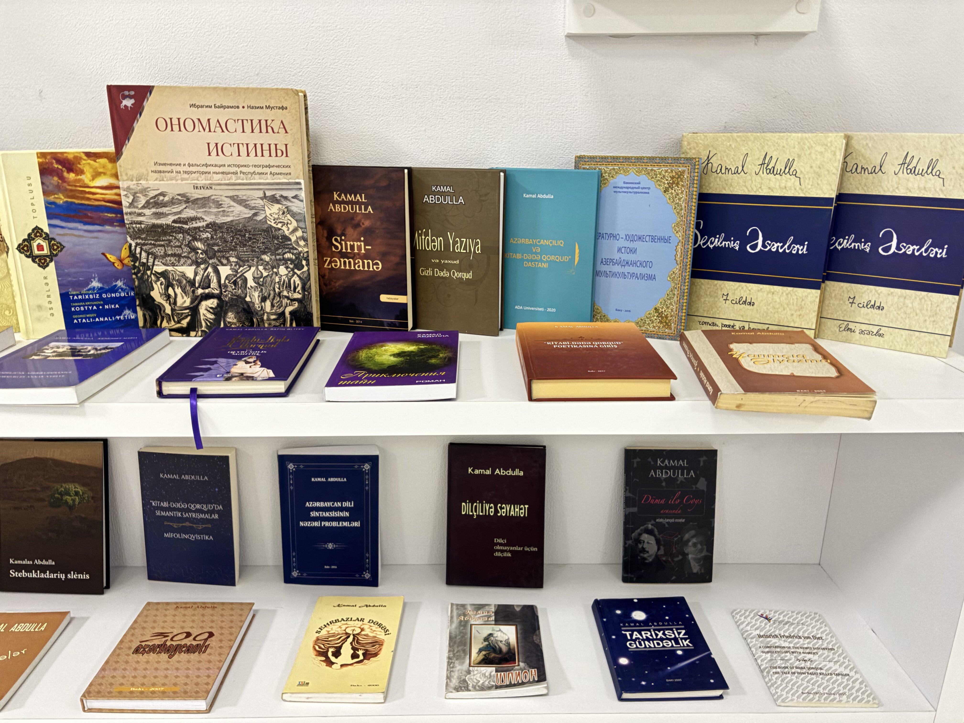 Sərgidə Kamal Abdullanın uzunmüddətli elmi fəaliyyətini, dilçilik sahəsində apardığı tədqiqatları və ədəbiyyatşünaslığa verdiyi mühüm töhfələri əks etdirən nəşrlər nümayiş olunur. Burada müəllifin “Seçilmiş əsərləri”nin yeddi cildliyi, “Sirri-zəmanə”, “Mifdən yazıya və yaxud gizli Dədə Qorqud”, “Müstəqillik dövründə ingilisdilli mətbuatda Azərbaycan obrazı (1993–2003)”, “Azərbaycançılıq və ‘Kitabi-Dədə Qorqud’ dastanı”, “Həqiqətin onomastikası” və digər elmi-ədəbi kitabları yer alıb.![]()