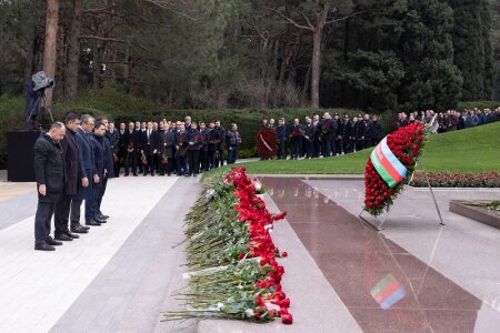 Ziyarət iştirakçıları Ulu Öndərin məzarı önünə əklil və gül dəstələri qoyub, dahi şəxsiyyətin əziz xatirəsini dərin hörmət və ehtiramla yad ediblər.![]()