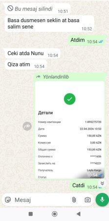 Vətəndaş əvvəlcə tərəddüd etsə də, qarşı tərəfin tələsdirməsi (“bir saatdı ata bilmirsən?”, “gec olar?”) nəticəsində pulu göndərməyə razılaşıb. Yazışmalarda həmçinin kart məlumatlarının silinməsi və yenidən göndərilməsi kimi şübhəli məqamlar da diqqət çəkir.
