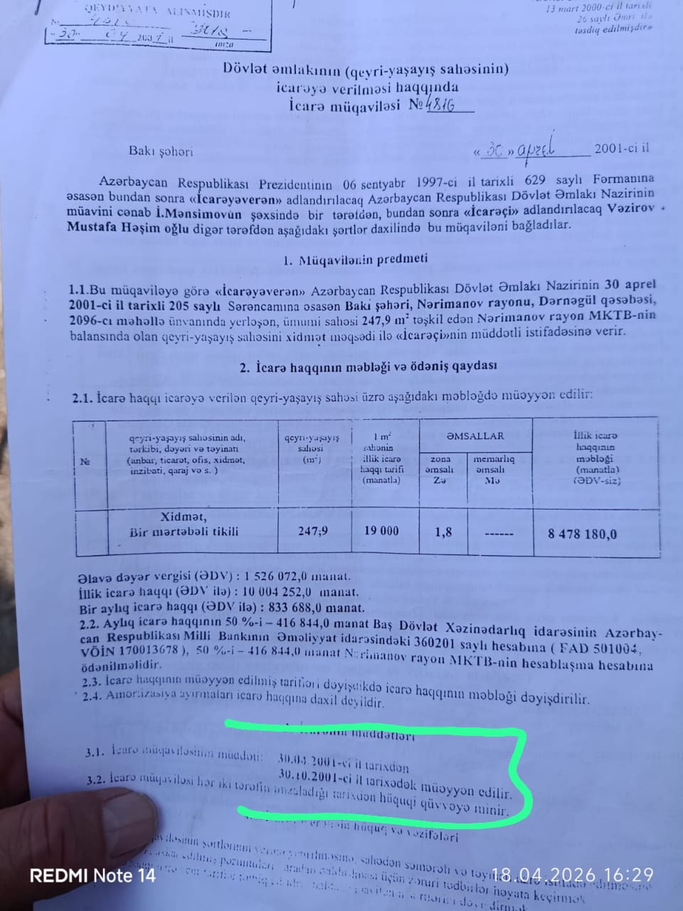 4816 saylı 30 aprel 2001-ci il tarixli icarə müddəti 30.03.2001-ci ildən 30.10.2001-il tarixədək olan müqavilə bağlanmışdır. Müqavilənin tarixlərindən də görünür ki, müddəti cəmi 7 ay olmuş və bitmişdir.