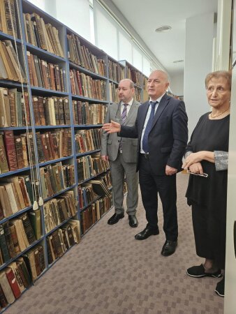 Kitabxananın fəaliyyəti ilə yaxından tanış olan qonaq, öncə MEK-in Qarabağ müharibəsi qəhrəmanları fondu, buradakı guşələr, toplanan dəyərli nəşrlər haqqında ətraflı məlumat alıb. Sonra qonaq AMEA-nın təsisçilərinin büstləri, zəngin kolleksiyaların saxlandığı Akademiklər kitabxanası, eləcə də Diplomatik fondda müxtəlif ölkələrin diplomatik nümayəndəliyi tərəfindən MEK-ə hədiyyə edilən kitablardan ibarət guşə, Nadir kitablar və Xarici dillərdə ədəbiyyat fondu ilə tanış olub. ![]()