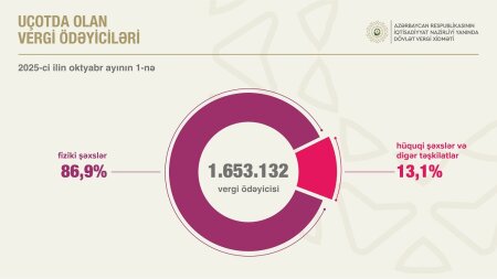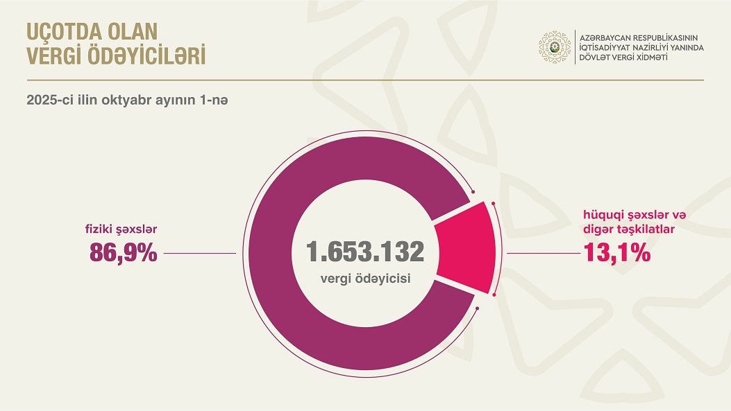 DVX-nin ictimaiyyətlə əlaqələr şöbəsindən Azia.az-a verilən məlumata görə, 2025-ci ilin oktyabr ayının 1-nə respublika üzrə uçotda olan 1.653.132 vergi ödəyicisinin 86,9 faizi fiziki şəxs, 13,1 faizi hüquqi şəxs və digər təşkilatlar olub. Ötən ilin müvafiq dövrü ilə müqayisədə vergi ödəyicilərinin ümumi sayı 4,8 faiz, o cümlədən fiziki şəxslərin sayı 4,5, hüquqi şəxslərin sayı 7,2 faiz artıb.