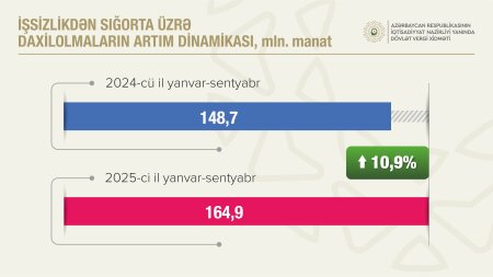 İşsizlikdən sığorta haqları üzrə daxilolmalar 2024-cü ilin eyni dövrü ilə müqayisədə 10,9 faiz artıb və 164,9 milyon manat təşkil edib. Qeyri-büdcə təşkilatları üzrə daxilolmalar 12,2 faiz artaraq 126,1 milyon manat olub.