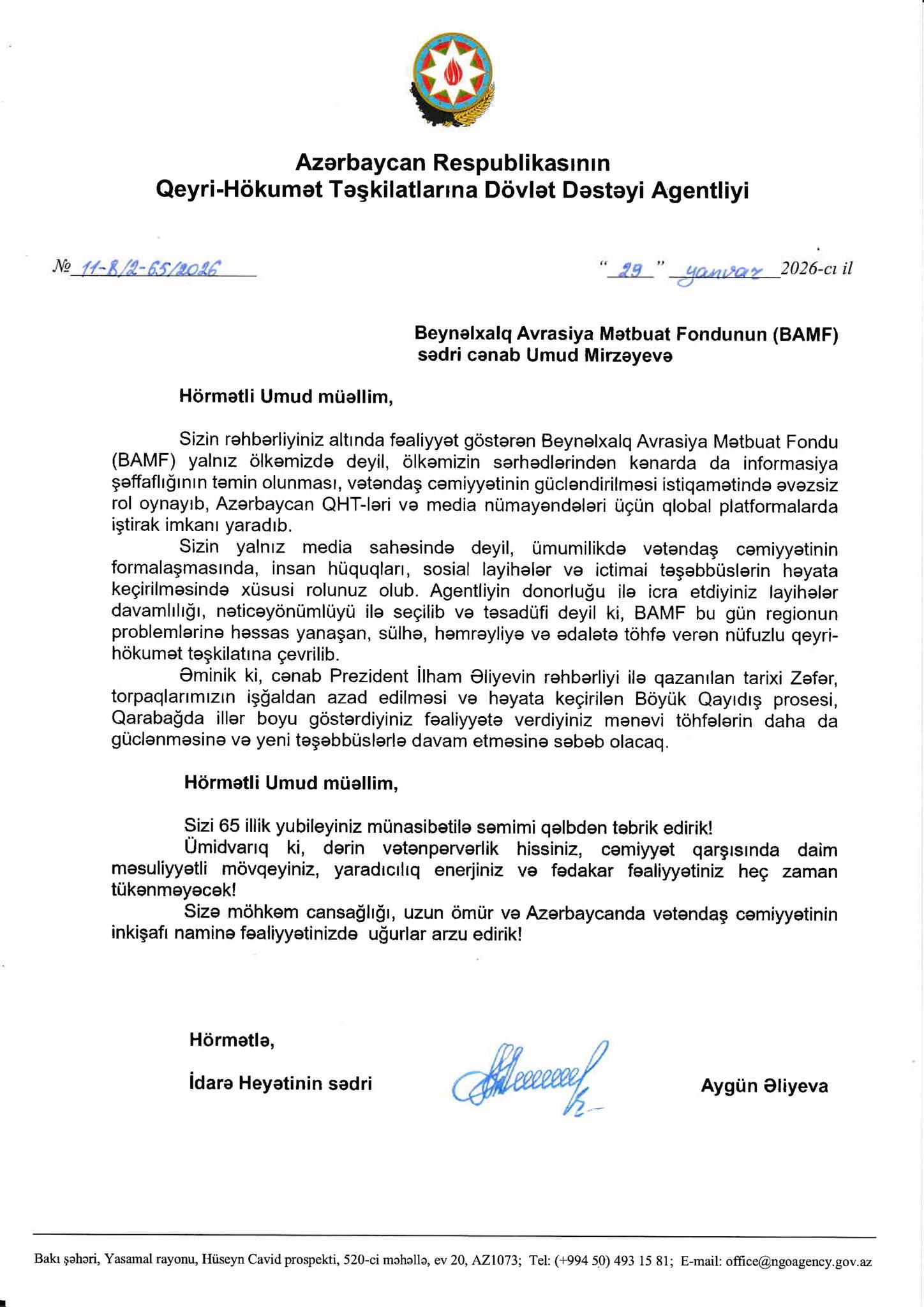 Azərbaycan Respublikasının Qeyri-Hökumət Təşkilatlarına Dövlət Dəstəyi Agentliyinin İdarə Heyətinin sədri Aygün Əliyeva Beynəlxalq Avrasiya Mətbuat Fondunun (BAMF) sədri Umud Mirzəyevi 65 illik yubileyi münasibətilə təbrik edib.
