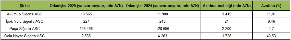 Lakin bəzi sığorta şirkətlərinin ödənişlərində sözügedən dövr ərzində azalma müşahidə olunub.